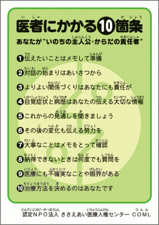 初回スマホアプリに配信する情報は,患者が主人公になって医療に参加するための心構えである『医者にかかる10箇条』。この10箇条は,COMLが研究班の一員として素案づくりを手がけ,インフォームド・コンセントに患者が主体的にかかわっていくことを願って,1998年厚生省「患者から医師への質問内容・方法に関する研究」研究班から発表されたものである。現在はCOMLより小冊子『新・医者にかかる10箇条』として発行されている。
