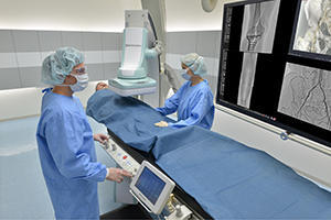 血管撮影システムは,狭窄した血管をカテーテルで拡張する血管内治療の際に使用されるX線撮影装置。血管内治療は,外科治療と比較して低侵襲なことから,治療技術の確立が進んでいる。下肢領域においては,高血圧や糖尿病を原因とする動脈硬化によって狭窄した血管のカテーテル治療が増加傾向にあり,患者の被ばくや造影剤投与量を低減する技術が求められている。