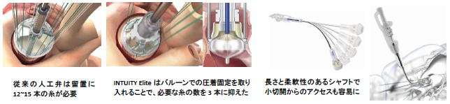 従来の人工弁は,12本〜15本の糸を1本ずつ結んで固定する。この複雑な固定法が,狭い傷口から手術を行うMICSの難易度が上がる要因のひとつであった。一方,新製品のINTUITY Eliteは,わずか3本の糸と,バルーンで拡張したフレームによって圧着固定し,留置するため,手術時間を短縮することができる。弁留置の手順を簡素化することで,よりMICSや複合手術に適した特徴を持つ,手術時間短縮に貢献する人工弁となっている。
