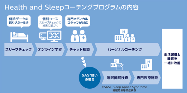 フィリップス・レスピロニクス(同)と(株)iCAREは従業員の睡眠課題における解決の実現のため,(株)iCAREの既存契約企業に対して睡眠に関するアンケートの配信を行い,SASの疑いがある参加者に対して簡易検査を行う取り組みを開始している。簡易検査後SASの疑いがある方には,(株)iCAREのメディカルスタッフが参加者に対してチャットでフォローをし,専門医療機関の紹介を行う。また,SAS以外の原因の方についても睡眠の質を高めるための睡眠スキルのアドバイスを行う。こうした取り組みにより,SASの疑いがある人の病院受診の推奨を促し,従業員の睡眠課題の改善にコミットしたサービス提供を目指す。