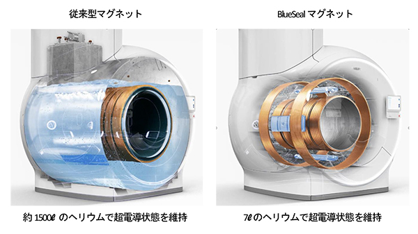 従来のマグネットは,超電導状態を維持するために約1500リットルのヘリウムでマグネットを冷却する必要があった。これに対し,新たに開発されたBlueSealマグネットは,冷却効率が非常に高いMicro-coolingテクノロジーを採用することにより,わずか7リットルのヘリウムで超電導状態を維持することができる(図1)。この7リットルのヘリウムはマグネット内に密封され,クエンチ発生によるヘリウムガスの外部排出が起こらない。このため,MR装置の耐用期間において,ヘリウム充填を必要としない検査運用が可能となる。