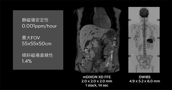 Ingenia Ambition 1.5TはMicro-coolingテクノロジーにより,高い静磁場安定性0.001ppm/hourならびに傾斜磁場直線性1.4%(50cmDSV時)を実現しており,最大FOV55cmにおいて歪みなく精度の高いMR検査を可能とする(図2)。さらに最新の高速化技術であるCompressed SENSEは,イメージクオリティーを損なうことなく最大50%の撮像時間短縮2を図れる。また,撮像時間を延長せずに60%の空間分解能向上2を図ることもでき,限られた検査時間の中で確信度の高い画像診断を行うための様々なニーズに対応することができる。