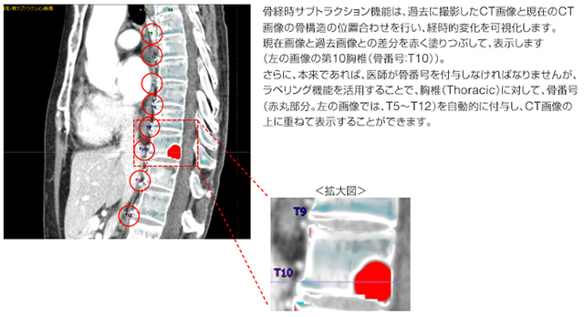 ・頸椎,胸椎,腰椎,肋骨をおのおの自動抽出し,医師が疾患の場所などを指し示す際に引用する「骨番号」を自動的に付与し,CT画像の上に重ねて表示する。これにより,骨が見分けにくい画像での番号の振り間違いを抑制するとともに,医師の作業負荷を軽減する。