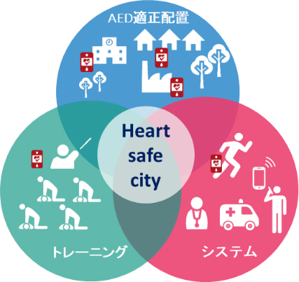 Heart safe city運用にあたり個人情報の問題や地域住民への参加において行政や自治体からの協力なしでは実現不可能である。根本となるものは,地域にいる人とのつながりであり,そのつながりが自助・共助を生み出す。様々な組織がそれぞれの役割を担いながら,新しいまちの価値として認識し,協働することが必要不可欠となる。