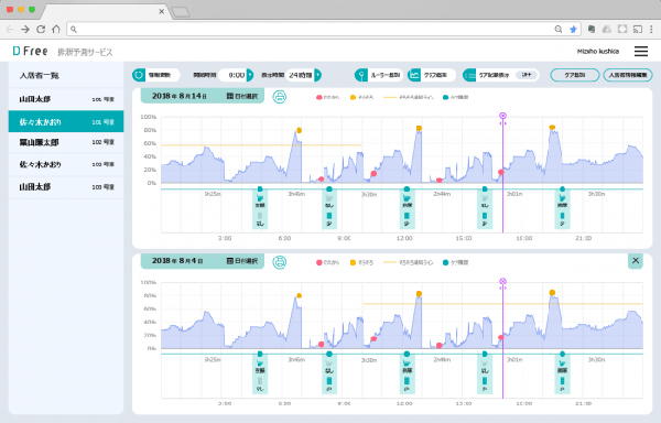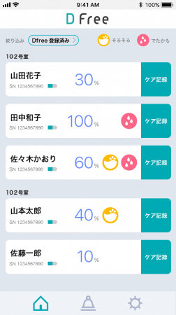 介護施設や医療機関などの法人向けのサービスで,「DFree」を入居者・入院患者などに装着してもらい,排泄リズム(周期や傾向)を見える化して,排泄ケアの個別化や自立支援,リハビリなどをサポートする。複数の利用者データを一覧で管理でき,各種携帯端末へトイレのタイミングを通知したり,ケアの履歴をグラフで表示するなどの機能がある。携帯端末の専用アプリは,iOS版,Android版がある。DFreeで取得したデータは,中継器を経てクラウドサーバーで保管される。