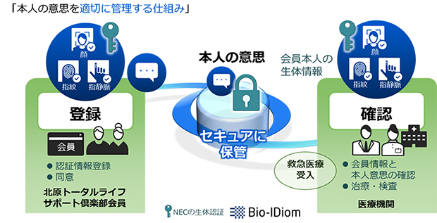 今回の実証では,「北原トータルライフサポート倶楽部」の会員を対象に,医療機関の救急医療受入時において,生体認証を用いた本人確認の円滑かつ安全な実施,DLWに登録された本人意思の確認,および,救急医療等の効率的・効果的な実施に資することについての確認を行う。生体認証を用いた本人確認は,世界トップクラスの技術や豊富な実績のあるNECの生体認証「Bio-IDiom」(注7)の顔認証や指静脈・指紋認証を組み合わせて行う。