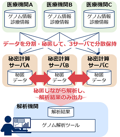 近年,個人のゲノム情報に適した効果的な薬を開発するため,ゲノムと疾病の関係を解析するゲノム解析が活発化している。しかし,解析で使用するこれらのデータは機微性が極めて高い個人情報であるため,医療機関や研究機関間で共有することは容易ではなかった。