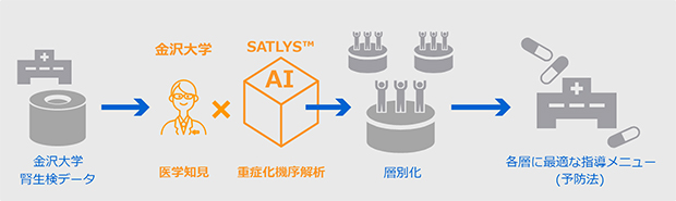 国立大学法人金沢大学(以下,金沢大学)医薬保健研究域医学系の和田 隆志教授らの研究グループと,(株)東芝(以下,東芝),東芝デジタルソリューションズ(株)(以下,東芝デジタルソリューションズ)は,糖尿病性腎症の重症化メカニズムの解明により精密医療の実現を目指す共同研究を開始した。本共同研究では,東芝デジタルソリューションズのアナリティクスAI「SATLYS™」(※1)を活用することで,透析導入および重篤な合併症を引き起こす可能性がある糖尿病性腎症重症化メカニズムを解析する。さらに,リスクごとに詳細に層別化・体系化された予防法を開発することで,患者のクオリティ・オブ・ライフ(QOL)向上を目指す。