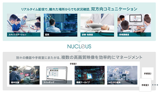 ソニーは従来から,手術部位を撮影する4Kカメラ,手術現場で映像を確認する4K液晶モニター,映像を記録する4Kレコーダー,ネットワーク経由でデータを管理するコンテンツマネジメントシステムなど,高画質イメージングおよびビデオ技術を生かした医療周辺機器を提供している。これらのハードの強みとともに,ソフトウェアプラットフォームであるNUCLeUSを新たに商品構成に取り入れることで,病院内の統合的なソリューションを提案していく。