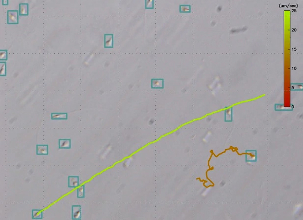 良好な精子は直進性が良好で,速度は速い(黄緑色)。
