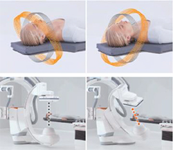 従来の3D回転撮影は,左右方向の一定軌道回転のみだったため,コーンビームCT特有のアーチファクトが生じていた。ARTIS iconoは回転撮影中に頭尾方向の傾斜を加えた独自の二重軌道回転機構により,多方向のスキャンデータによる3D画像再構成が可能になった。骨構造近くの出血などの描出能も向上し,さらなる高画質CTライクイメージングを提供する。