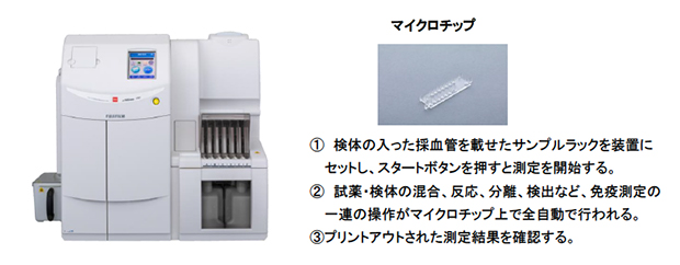 ※5 マイクロトータルアナリシスシステム(μTAS)を採用。混合,反応,分離,検出という免疫 測定の一連の操作を微細加工技術を用いて作成したマイクロチップの流路内に集積した分析システム。