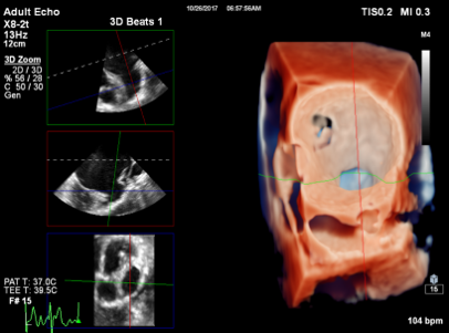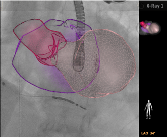 今回,新たにバーチャルモデルによるAnatomical Intelligenceモード(解剖学的知能モード)を搭載。自動でセグメンテーションすることで,心室や,心房全体および僧帽弁や左心耳などのアンギオ画像では確認することができない動的組織モデルとアンギオ断面とのフュージョンも容易になり,デバイスが目的の留置位置に存在するか,カテーテルの先端による心臓壁穿孔のリスクがないかなど,リアルタイムにアンギオ画像とエコー画像が一体となり画期的な機能が追加され,さらに直感的に視覚化することが可能となった。