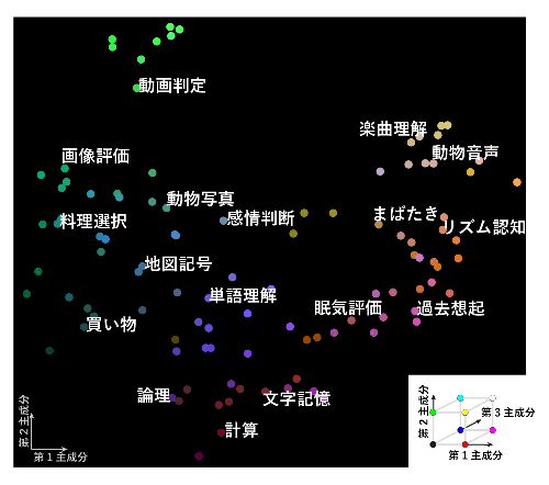 第1のモデルは,課題の各特徴量を1か0で離散的に表現した課題種類モデルであり,このモデルを用いることで,103種類の課題それぞれに対する大脳各領域の寄与データを抽出することができる。得られた寄与データに対して主成分分析を実施することにより,103種類の課題の関係性を示す認知情報表現空間を可視化した(図1参照)。この空間上では,脳における表現が似ている課題ほど近い色で近くに配置されるようになっている。