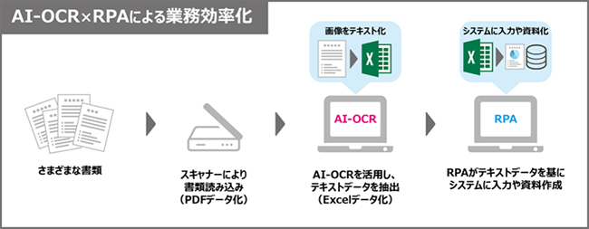 本取り組みでは,勤務報告書や法定講習アンケートなどの手書き書類をスキャナーで読み込んだ後,認識 精度の高いAI-OCRを利用して,自動で文字データに変換する。さらに,定型作業を自動化するRPAがデータの集計やシステムへの入力を行うことで,報告書を自動作成する。