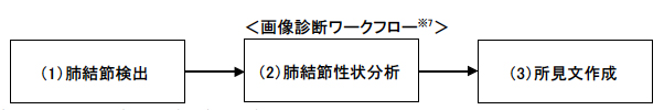 1.胸部CT画像から肺結節の候補を自動で検出し,検出箇所をマークして表示する。医師は画像確認を行った後,マークされた箇所を再確認し,肺結節かどうかを判断する。