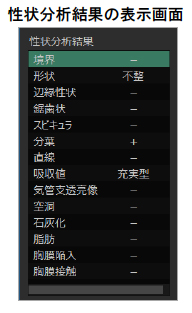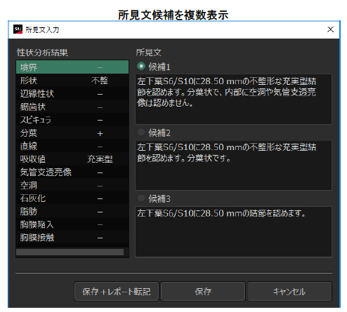 肺結節の性状を分析して結果を表示するとともに,対象の所見文候補を提示する機能。医師が所見を書く作業をサポートする。