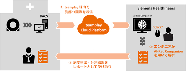 2) シーメンスヘルスケアのエンジニアがteamplay Image上で同画像を受領し,AI-Rad Companionを用いて解析処理を行う