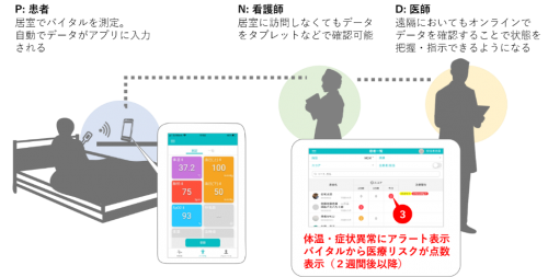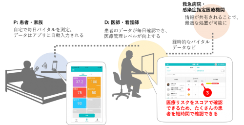 COVID-19の軽症者・無症状者に対し,医療者配置が十分でない(ホテルを含む)在宅医療での健康管理体制は喫緊の課題である。医師や看護師の感染を予防しつつ,急変した状態を早期に発見し,かつ不要な搬送を避けるスクリーニングが重要。そこでCOVID-19対策として,在宅医療患者に対し,体温・酸素飽和度といったバイタルサイン,及び症状観察,既往歴をICTにて収集・分析・閲覧できる「ICT遠隔モニタリングシステム」を提言する。大きな特徴として,多くのCOVID-19患者に見られる発熱に関し,体温37.5℃といった絶対値基準ではなく,個々人のデータより統計学に基づきテーラーメイドで異常値を検知しアラーティングする機能により,高齢者など加齢の影響で体温低下している患者でも早期発見が可能となる。また異常値や酸素飽和度等の閾値をスコア分布表に配点し,医療リスクを算出する「バイタルスコアリング」機能を技術により,医療介入(入院)のスクリーニングが可能となる。このシステムにより医療資源の乏しい在宅でも入院と同じ様な健康管理体制が構築でき,更に重症度評価により,病院搬送のタイミングを図ることが可能となる。