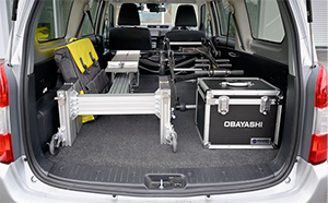 ホテルやテント等でも弊社Comfyと一緒に持ち込めば,普段と遜色のない撮影室が簡単に完成する。折りたたみや組み立ても簡単。キャスター付きで楽々搬入ができます。また35kgという軽量設計なので階段でも大人2名で十分運搬可能である。積載性にもこだわり,Comfyを含めた撮影機材一式及び2名乗車をミニバンではなく5ナンバーワゴン車で実現した。