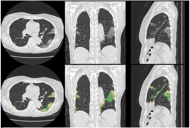 新型コロナウイルス肺炎のCT診断画像及びその解析結果(上段 原画,下段 解析結果)