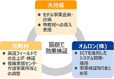 大分県とオムロンが密接に連携し,高齢者が要介護状態等となることの予防又は要介護状態等の軽減若しくは悪化の防止が図れるよう,大分県内において自立支援に資するサービスが適切に導入・実施出来る体制整備を行うことで,高齢者福祉の向上及び県民の健康寿命を延伸することを目指していく。