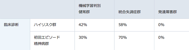 今回開発した機械学習器は,統合失調症の異なる臨床病期(精神病ハイリスク,初回エピソード精神病)(注1)の脳画像データを当てはめると,統合失調症,健常対照どちらかに判別され,発達障害と判別されることはなかった。そのため,本研究による機械学習器は,臨床現場で必要とされる,鑑別診断や治療予測などのマーカーとしての応用が期待される。