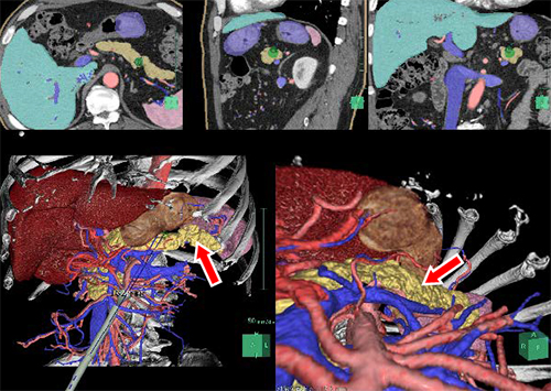 肝胆膵外科・消化器外科の高いニーズに応え,抽出が難しいとされる膵臓のセグメンテーションが可能。従来は手動かつ熟練度に依存していたが,AI技術を活用し設計したセグメンテーション機能で,膵臓と周囲の血管や臓器との位置関係を明瞭に抽出することができる。これにより,肝胆膵領域の術前シミュレーションの幅が広がる。