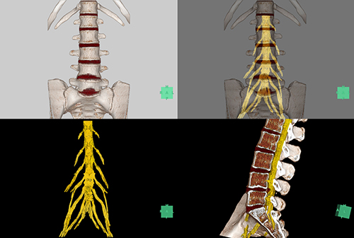 MRIの画像から自動で腰神経のみを抽出でき,CTの骨画像とMRIの腰神経をフュージョンすることで,骨と神経の位置関係が確認できる。例えば腰椎すべり症※3 の手術においては,骨と神経の位置関係を把握し適切な手術方法の選択に役立てることができる。