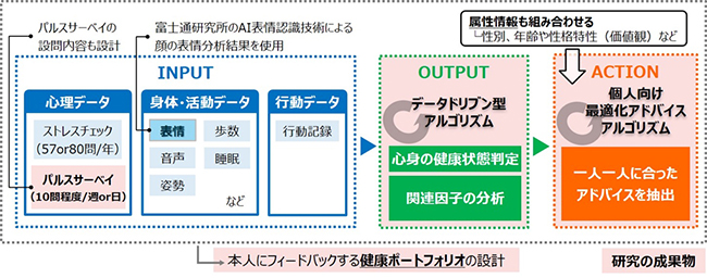 東京大学川上研究室が保有する認知行動療法などの健康関連の様々な調査データや文献をベースに,従業員向けに毎日もしくは毎週実施する「e診断」を用いたパルスサーベイと,富士通研究所が開発したAI表情認識技術を組み合わせ,心身の健康に関するデータと顔の表情から従業員一人ひとりの心身の健康状態の判定や健康関連因子の分析を行うデータドリブン型アルゴリズムを開発する。