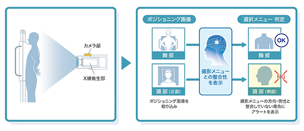 さらに,AI技術を用いた※2「ポジショニングナビ機能」※3を搭載。「CALNEO Compact」のX線発生部に取り付けられたカメラで撮影した被検者のポジショニング画像が「Console Advance」に自動送信され,撮影する向きがあらかじめ登録した撮影メニューと一致しない場合には「Console Advance」にアラートを表示する。これによりポジショニングの不整合による再撮影の低減が期待できる。