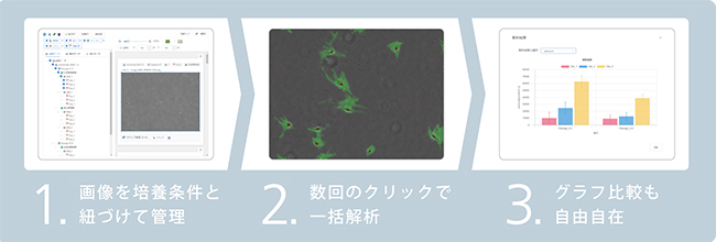 ラボやオフィスに点在する細胞画像データを集約し,最大登録ユーザー20人が共有・管理できる。細胞種や培地といった条件ごとの一覧表示が可能で,アップロードした画像の管理がスムーズとなる。