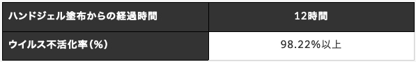 ハンドジェル塗布12時間後の試験フィルムは,98%以上のウイルス不活化が認められた。(表2)
