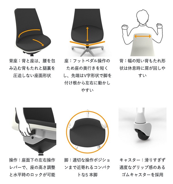 操作:座面下の左右操作レバーで,座の高さ調整と水平時のロックが可能。ロックを解除すると前傾します