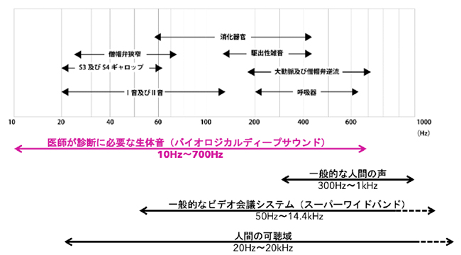 ⼀⽅,在宅診療時や発熱外来と医師の居る診察室を繋ぎ,より遠距離から聴診を⾏いたいとする要望が数多く寄せられており,またオンライン診療への応⽤を望む声も ⼤きくなって来ている。しかしながら多くのビデオ会議システムは聴診⾳をノイズとしてとらえており,通信に送る際にカットされてしまい,聴診⾳を伝送することが困難だった。