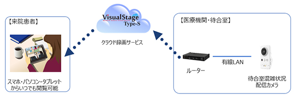 来院患者向けにリアルタイムで診療所の受付や待合室の混雑状況を映像配信することで,密回避を促すとともに安心して来院できる環境を提供する。主に小規模病院や診療所向けのパッケージ。