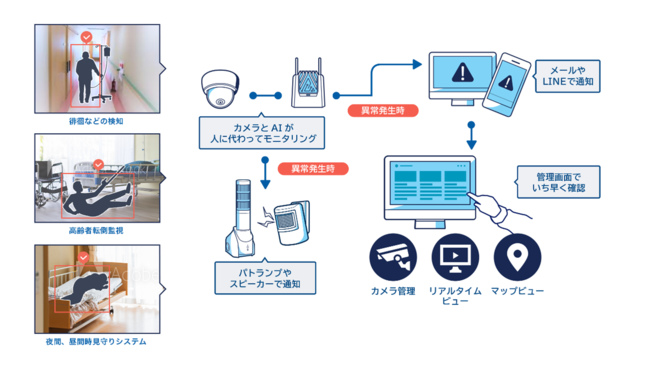 まず,本実証実験の第一弾として,社会福祉法人元気村が運営する介護施設「かわぐち翔裕園」内にカメラおよび「Edge AI Box」を導入し,「EDGEMATRIX」サービスで提供している徘徊者検知や侵入検知のAIアプリを活用することによる効果の検証および現場の利用環境に合わせたカスタマイズを進めるとともに,医療・介護向けの新たなAIの開発および検証を行う。「映像エッジAI」の活用により,映像データをクラウドにアップロードすることなく,現場に設置する「Edge AI Box」内でAI処理を行ったデータから異常の検知などを行うことが可能となるため,介護を受ける方や職員のプライバシーを保護しながら映像ソリューションを利用することができる。