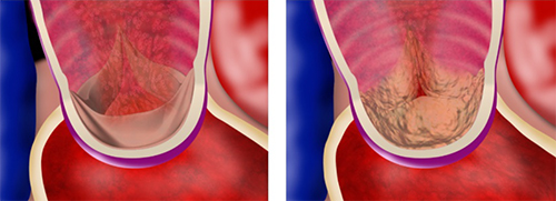 正常な大動脈弁(左)と,狭窄した大動脈弁(右)