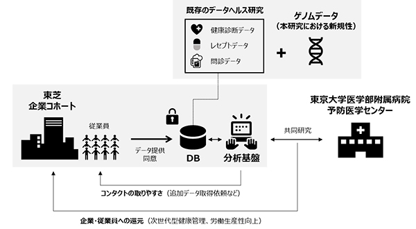 同社と東京大学医学部附属病院は,今般締結した共同研究契約に基づき,企業コホートデータを活用した新たな取組みとして,労働者の健康診断データ,問診データ,レセプトデータ(*4)にゲノムデータを加え,クオリティ・オブ・ライフ(以下「QOL」)や労働生産性に与える影響が大きい生活習慣病等を対象とした研究の検討を開始する(*5)。同社と東京大学は,個々人に最適化された生活様式や治療法を提供すると共に,労働者の健康的生活を支えるシステムを構築し,データ提供者へ還元していくことを目指す。