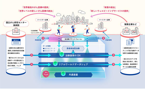 本共同研究では,国立研究開発法人国立がん研究センター東病院(注3)(以下,国立がん研究センター東病院)が有する電子カルテシステムの診療情報に加え,症例研究の情報や,同病院に通院される患者の健康情報をはじめとするPersonal Health Record(注4)(以下,PHR)を匿名化したうえで,医薬品開発や予防医療などに利活用可能なデータとして製薬企業などに提供するプラットフォームを構築し,広範囲な情報と解析サービスによる新しい価値の創出を目指す。また,治験においても電子カルテシステムの診療情報を安全性の高い統計データに加工して医療機関や製薬企業の治験業務を効率化する新たなモデルを確立するとともに,日本における治験データの世界標準への適応を推進し,国際共同治験(注5)への積極的な参画を支援していく。