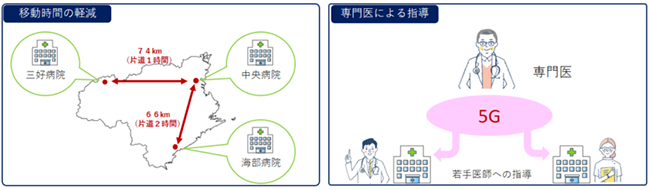 5G遠隔医療支援システムの活用により,例えば診療のため遠隔地へ出向いていた専門医と患者双方の移動時間の軽減や,各地域でも都市部と同等の医療を受けられることが期待される。