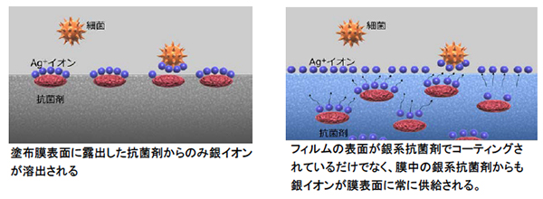 【一般的な非親水膜の銀系抗菌コート(左)と超親水膜の銀系抗菌コート技術「Hydro Ag+」(右)の構造(イメージ図)】