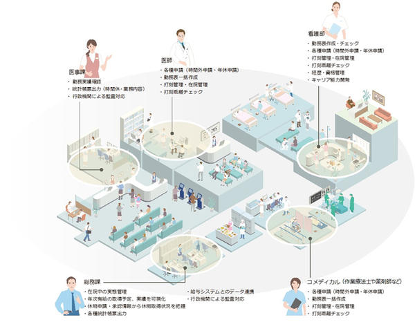 複雑な勤務形態に基づく労働時間の適正管理や院内全体のリソース管理を支援