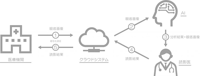 「DeepEyeVision」は,AIによる解析と医師による遠隔読影を組み合わせた,眼科向け画像AI診断支援サービス。医療機関が眼底画像をクラウドシステムにアップロードすると,「DeepEyeVision」内ではじめにAIが画像解析を行い,候補となる疾患名を読影医に提示する。続けて読影医は示された疾患名を参考にしながら,元の眼底画像を観察して診断を行い,その読影結果が医療機関に提供される。
