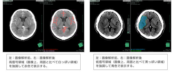 頭部CT画像の高信号および低信号領域に色をつけて強調し表示する。これらは脳内の出血領域や虚血範囲の評価に用いられ,頭部CT画像診断の支援に繋がることが期待される。