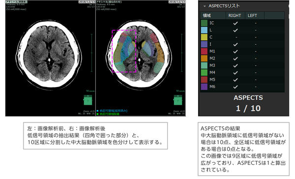 脳梗塞における血管内治療(静注血栓溶解法)の適用可否の判断には,虚血領域の広がりを定量化するスコア法である「ASPECTS」が用いられる。ASPECTSは,10区域に分けた中大脳動脈領域の各区域の虚血の有無や広がりを評価し,減点方式でスコア化する方法。通常,医師が頭の中で中大脳動脈領域を区分けして虚血領域の広がりを診るが,本機能は,中大脳動脈領域を自動で10区域に分割し色分けして表示するとともに,低信号領域の強調表示結果をスコアリングすることで,医師のASPECTS算出を支援する。※7