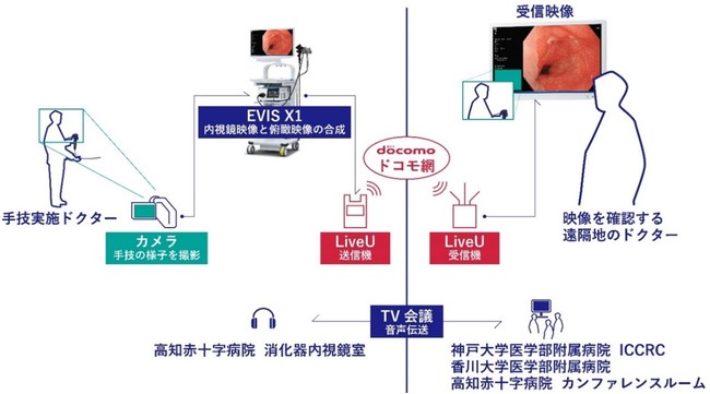 本実証実験は,ドコモが2020年9月30日(水)に報道発表した「5G を活用した映像伝送ソリューションの医療機関向けモニタープログラム」(以下,モニタープログラム)に参画した神戸大学,香川大学,高知赤十字病院によって行われた。オリンパスが製造・販売している内視鏡システム「EVIS X1(イーヴィス エックスワン)」を,モニタープログラムにて使用しているリアルタイム4K映像伝送システム「LiveU(ライヴユー)」に接続し,高知赤十字病院消化器内科内視鏡室で行われた内視鏡検査の4K映像を,4Gを6回線束ねた5Gと同等レベルの携帯電話回線を使い,神戸大学医学部附属病院国際がん医療・研究センター(ICCRC),香川大学医学部附属病院,高知赤十字病院カンファレンスルームに向けて伝送を試み,遠隔地での模擬トレーニングを実施した。また,内視鏡映像に加え,内視鏡画像に合成した手技を行う医師の手元の映像も遅延なく伝送することにも成功した。