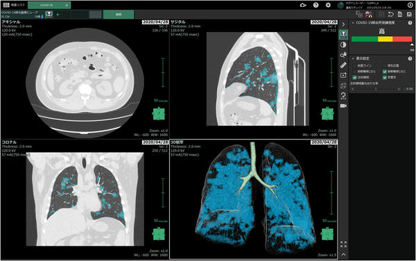 右上にCOVID-19肺炎所見を含む可能性(確信度)を三段階で表示。また,確信度の判定に寄与した領域を水色でマーキングする。アキシャル(体を水平に切断)・コロナル(体を前後に切断)・サジタル(体を垂直に切断)の三断面および3Dで表示が可能。