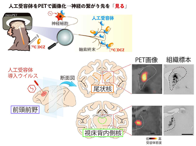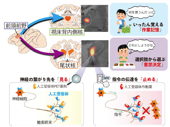 - 神経細胞に導入すると「スイッチ」のように働く人工受容体 2)を PET 3)で可視化する技術を用いて前頭前野から脳深部へ伸びる 2つの経路を画像化し,情報伝達を個別にオフにすることで 2つの機能をコントロール。この技術は,霊長類の高次脳機能の仕組みや,神経経路の不調による精神・神経疾患の発症機序の理解,治療法の開発につながることが期待される。