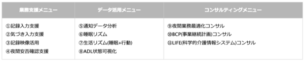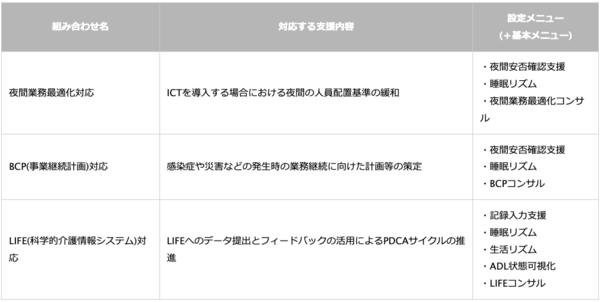 これらの組み合わせは,システムから取得したデータを活用し,介護施設の業務実態を可視化するだけでなく,実際のオペレーション設計まで落とし込むことで,改訂された介護報酬制度への対応を支援する。